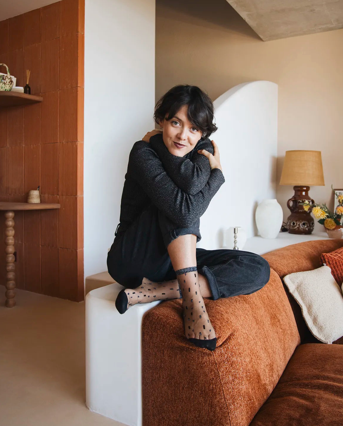 L'une des trois paires réalisées en collaboration avec Reqins. Douce aux pois discrets, cette paire de chaussettes s'inspire de la pluie qui tombe en montagne. Ce modèle rehaussera vos tenues avec chic. Il est à porter avec un pantalon noir ou un jean brut ou clair. On peut le porter avec des baskets, des escarpins ou des mocassins.