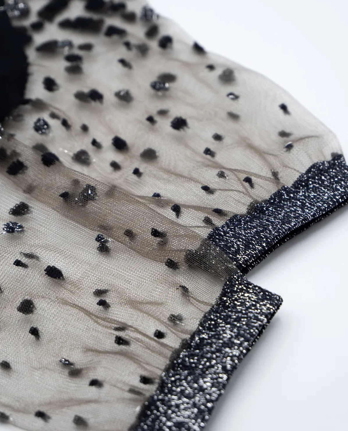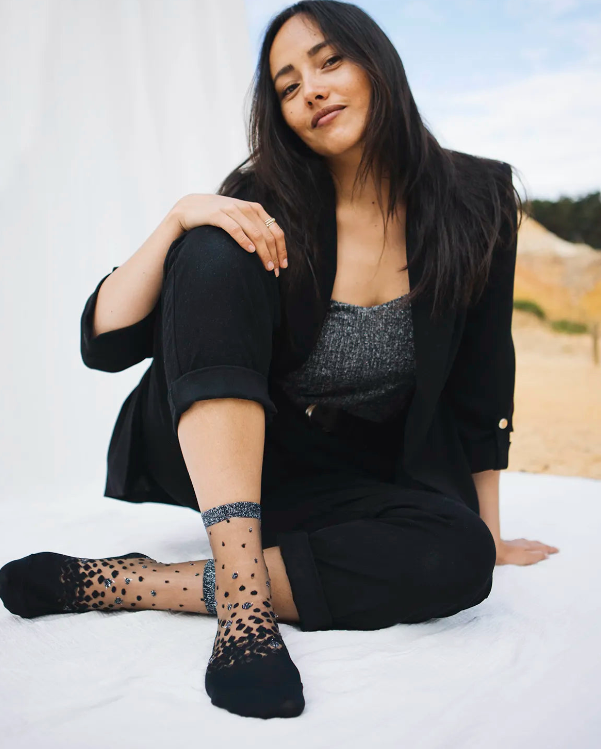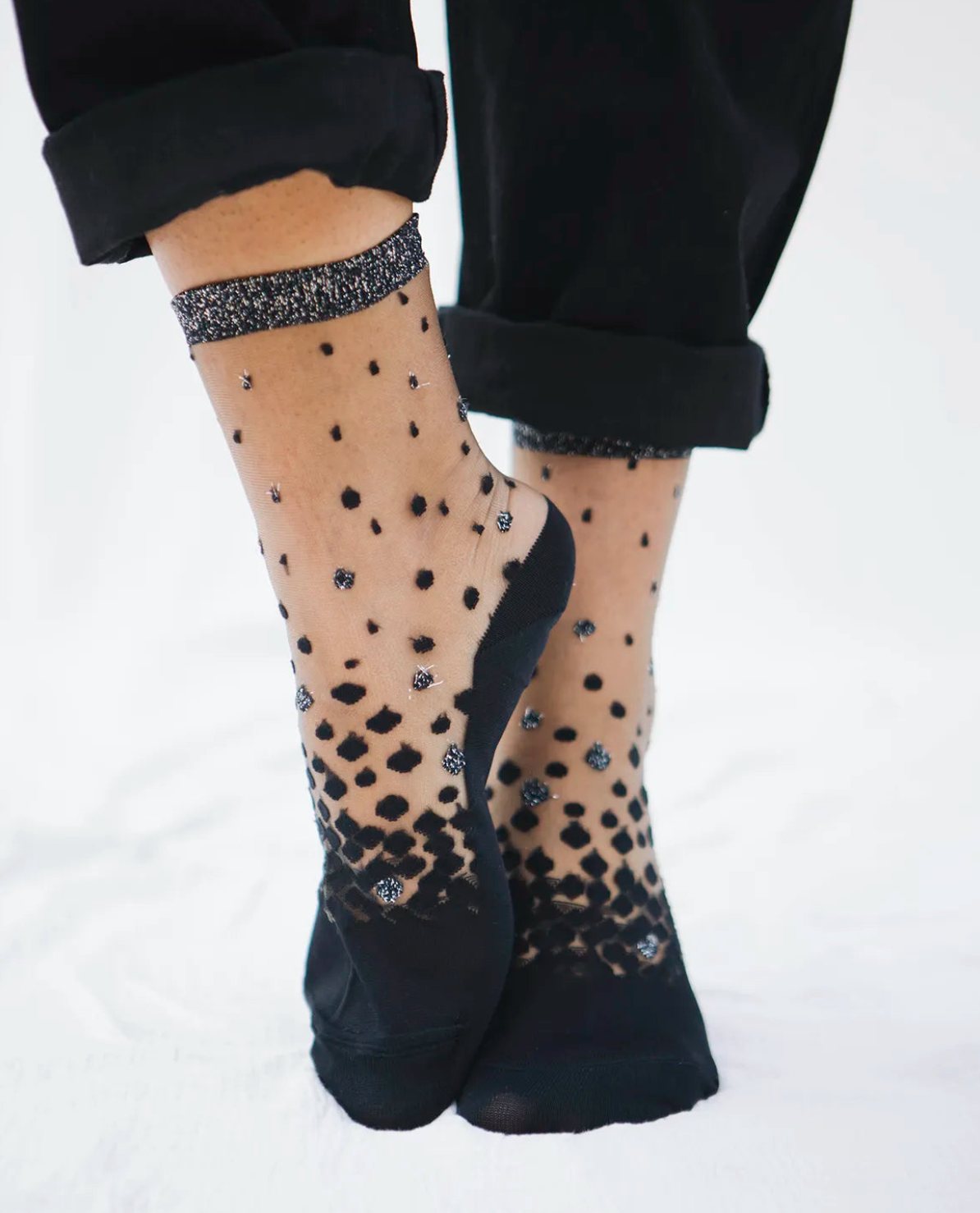 Nakameguro Silver. Dégradé de pois noirs et argentés sur un fond transparent : le classique plumetis revisité avec une touche de luminosité. Idéal autant avec des mocassins qu'avec des escarpins ! Inspiré de l'envolée des pétales de cerisier sur le canal de Nakameguro.