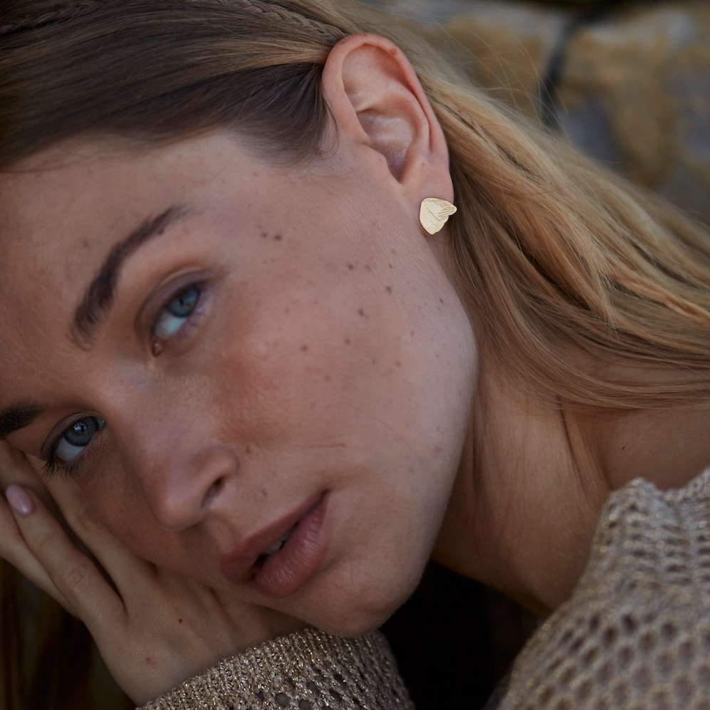 • Petites boucles d'oreille puces délicates dont les gravures fines sont inspirées par les nervures fines des fleurs clochettes vertes qui ornent l'arbuste charentais appelé Euphorbe. En laiton doré à l'or fin. Lumineuses, sobres et faciles à porter.