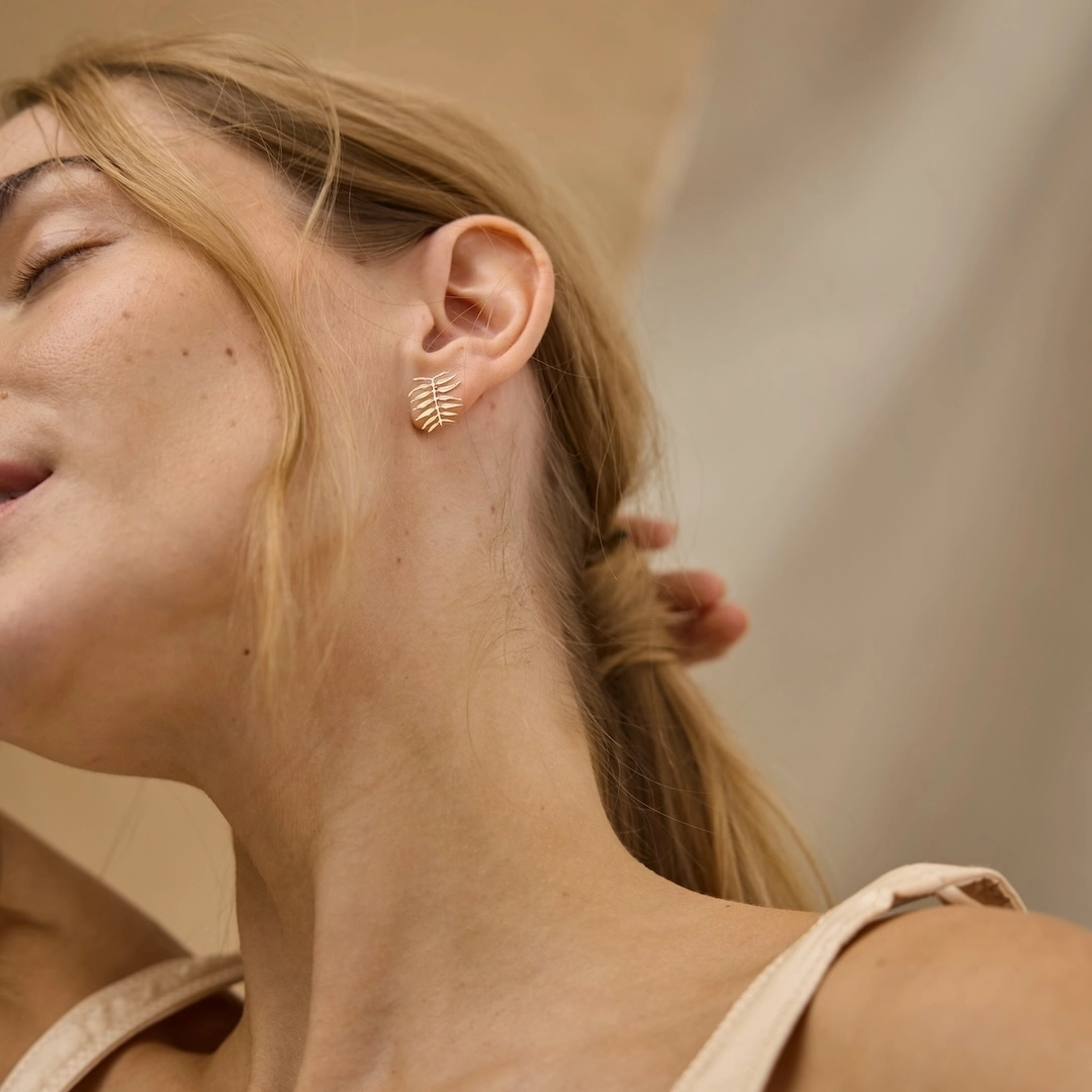 - - COLLECTION SOBORIA - Petites boucles d'oreille puces avec leur motif de feuille finement découpé. Le motif est inspiré par les feuilles élégantes et délicatement ciselées d'un arbuste appelé Sorbaria Sorbifolia. En laiton doré à l'or fin. Des boucles d'une extrême finesse et délicatesse, légères et féminines. • Dimensions du motif: l: 1,3 cm x H: 1,5 cm. • Composition: laiton doré à l'or fin 1 micron • Fabrication française