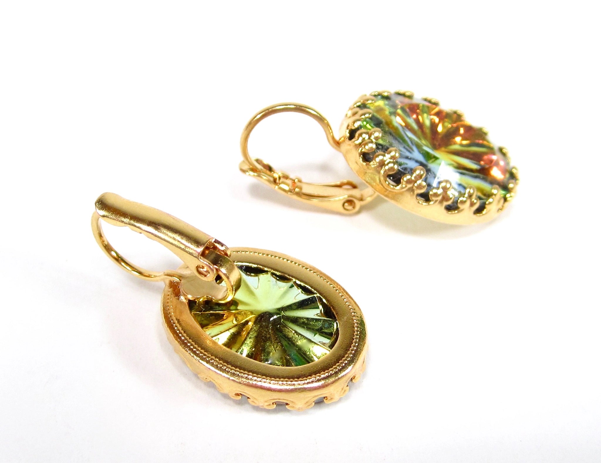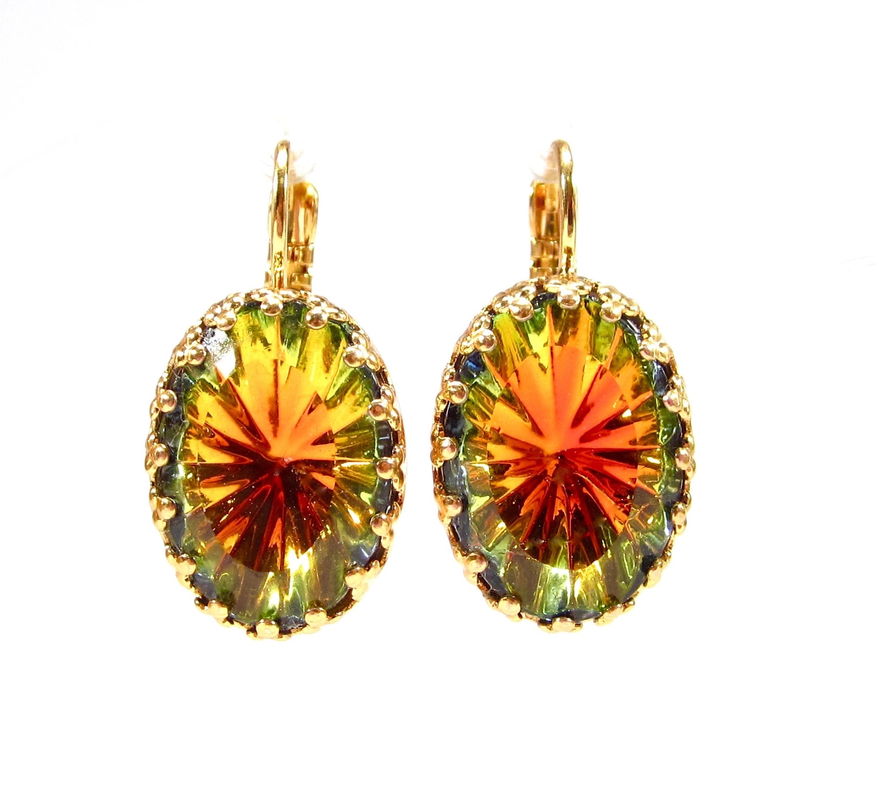 Boucles d'oreilles en verre orange vert or uniques bohemia verre vintage or pierres en verre faites à la main sertissage couronne doré à la main