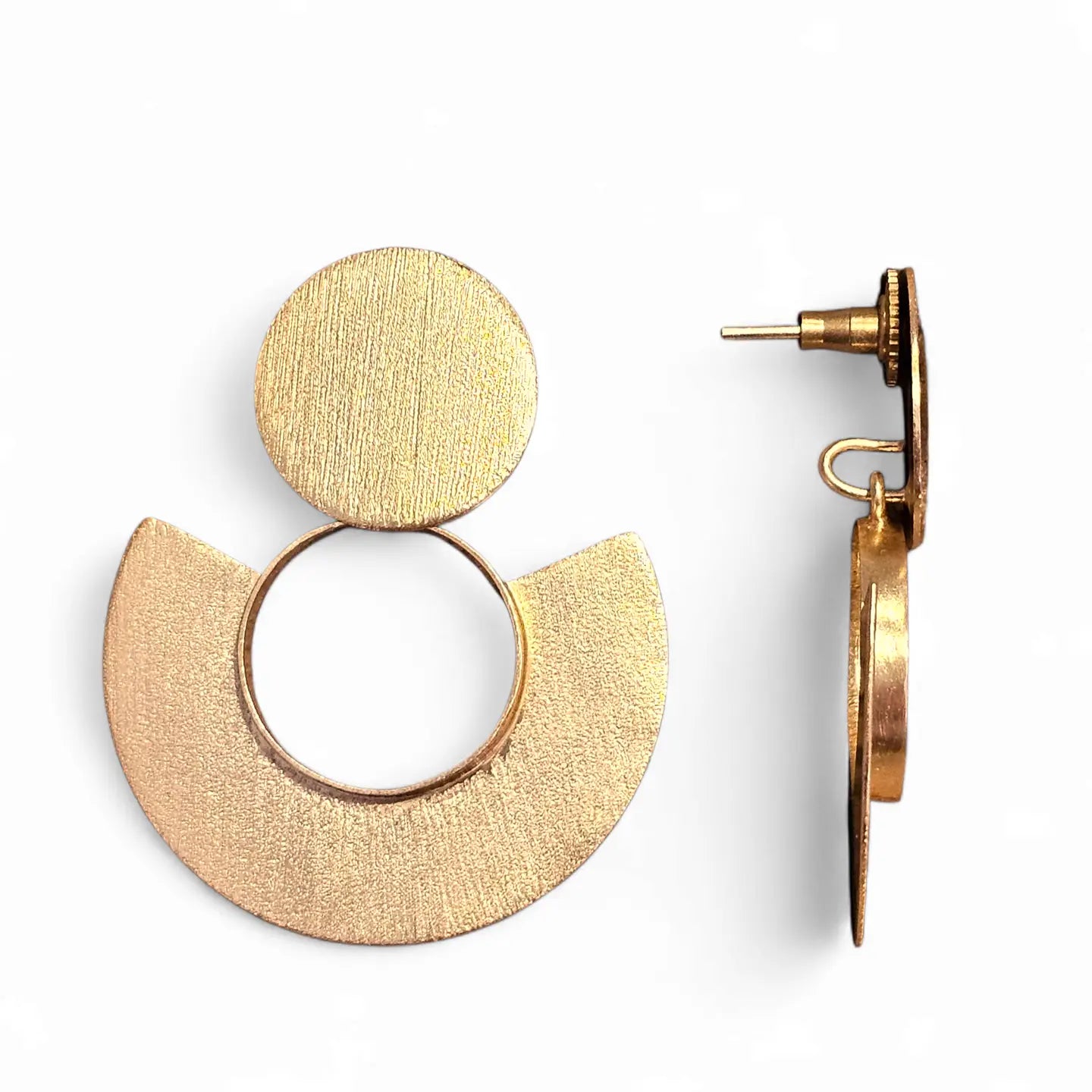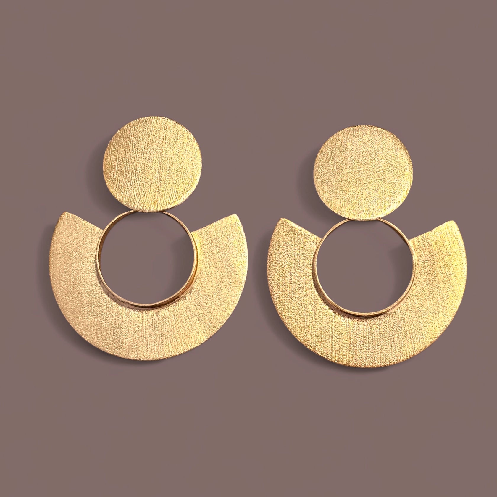 Light weight Aurea is air with weight. A golden circle anchors the ear, while a hand-sawn fan shape unfolds beneath sharp, minimal, and in perfect proportion. The design is a quiet gesture of movement and strength, crafted from raw brass with rhythm and care.