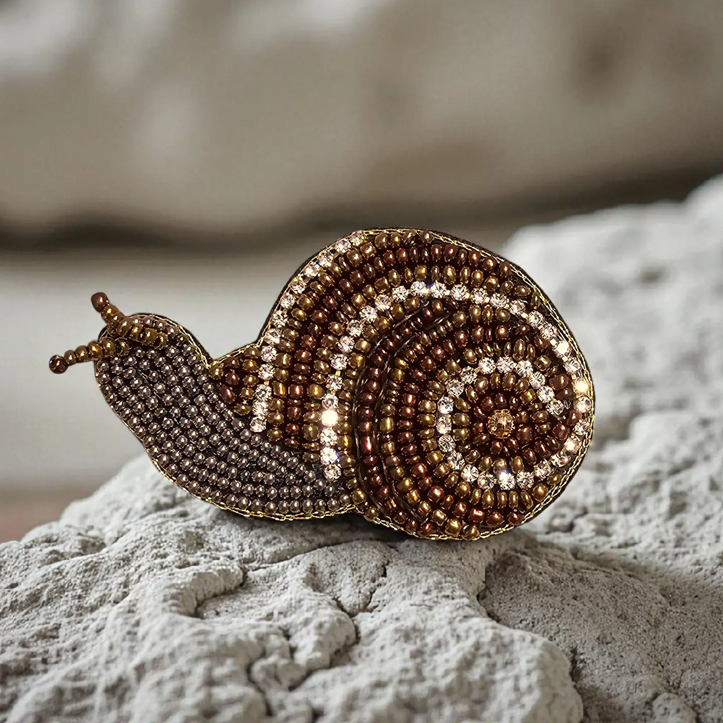 Helix Brooch transforms the snail into a delicate work of bead embroidery. Its 4 × 7 cm shape captures the spiraling shell and slow, graceful movement of the creature. Weighing 7.5 g, it’s light enough for everyday wear yet striking as an artful detail. In many cultures, the snail symbolizes patience and resilience — qualities reflected in the careful craftsmanship of this piece.