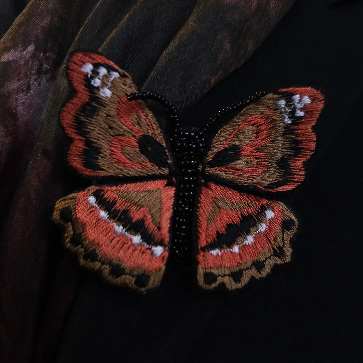Tavia Brooch captures the warmth of a butterfly in shades of brown and orange, handwoven in bead embroidery. Measuring 7 × 7 cm, the piece shimmers with intricate detail while staying light at just 5.7 g. A symbol of transformation and grace, Tavia brings earthy elegance and a touch of playfulness to the LONA LOOM collection.