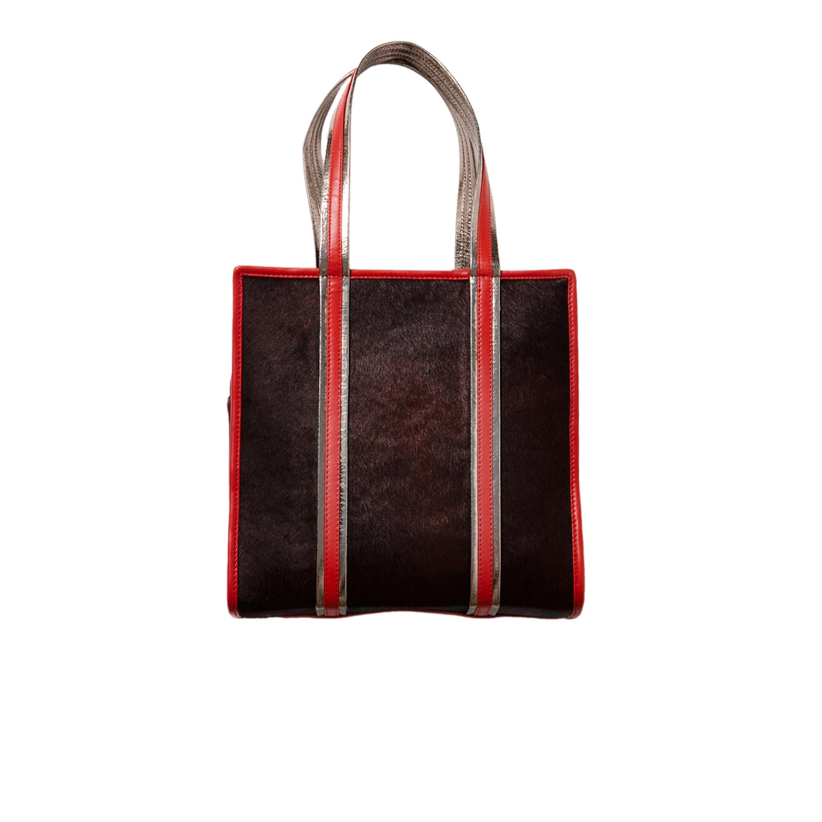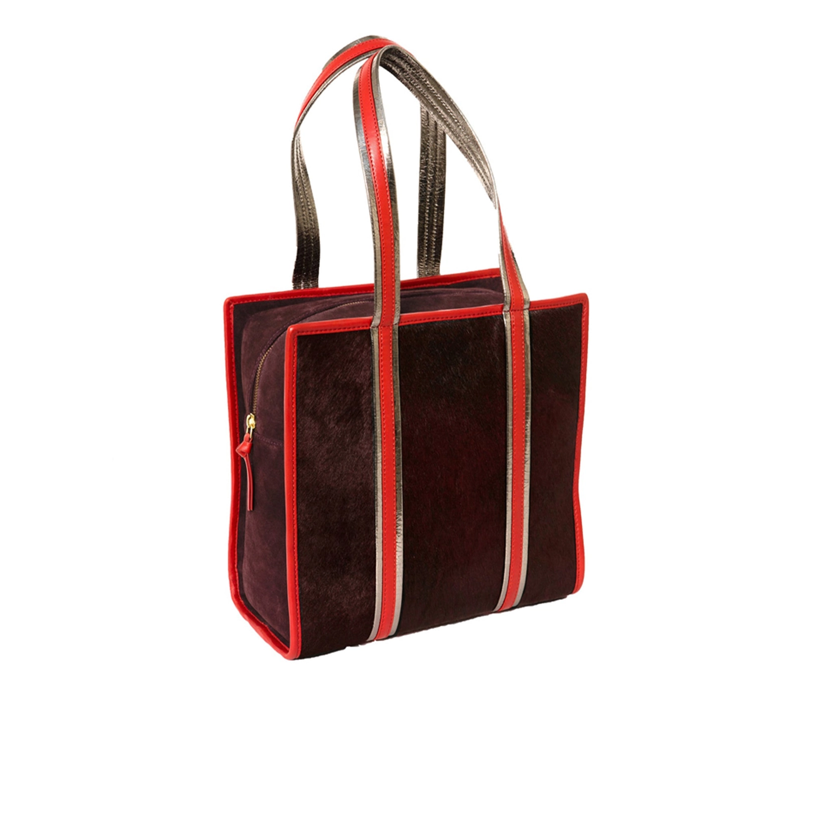 • Anses contrastées en cuir d'agneau de couleur métallisée et rouge